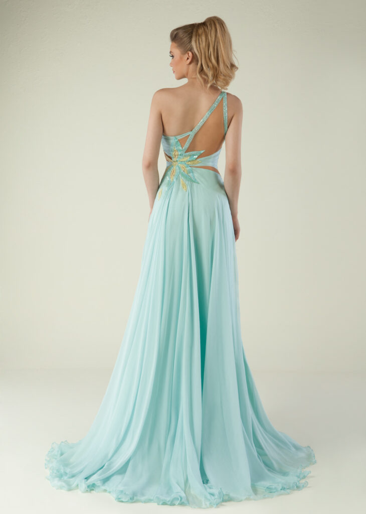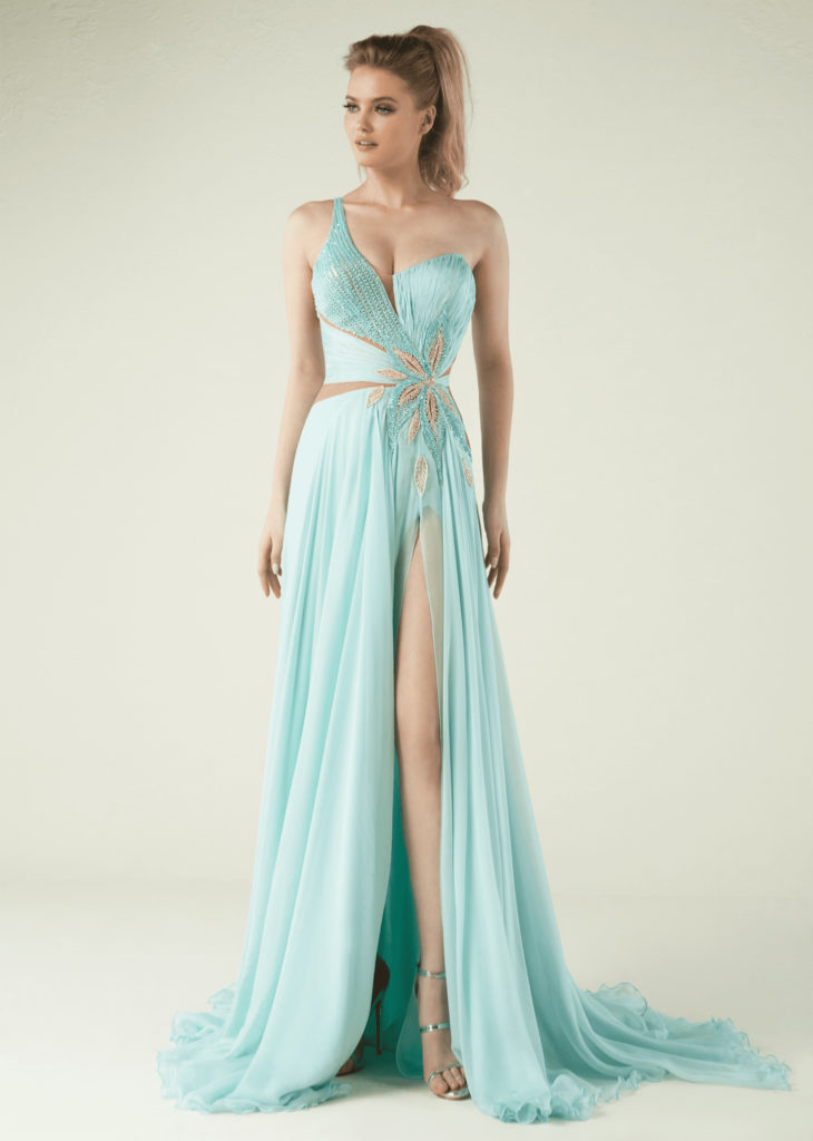 Long minted blue silk dress. Asymmetrical bust shape, one sided flower shape fully embroidered with crystal blue yellow beads on the waist.