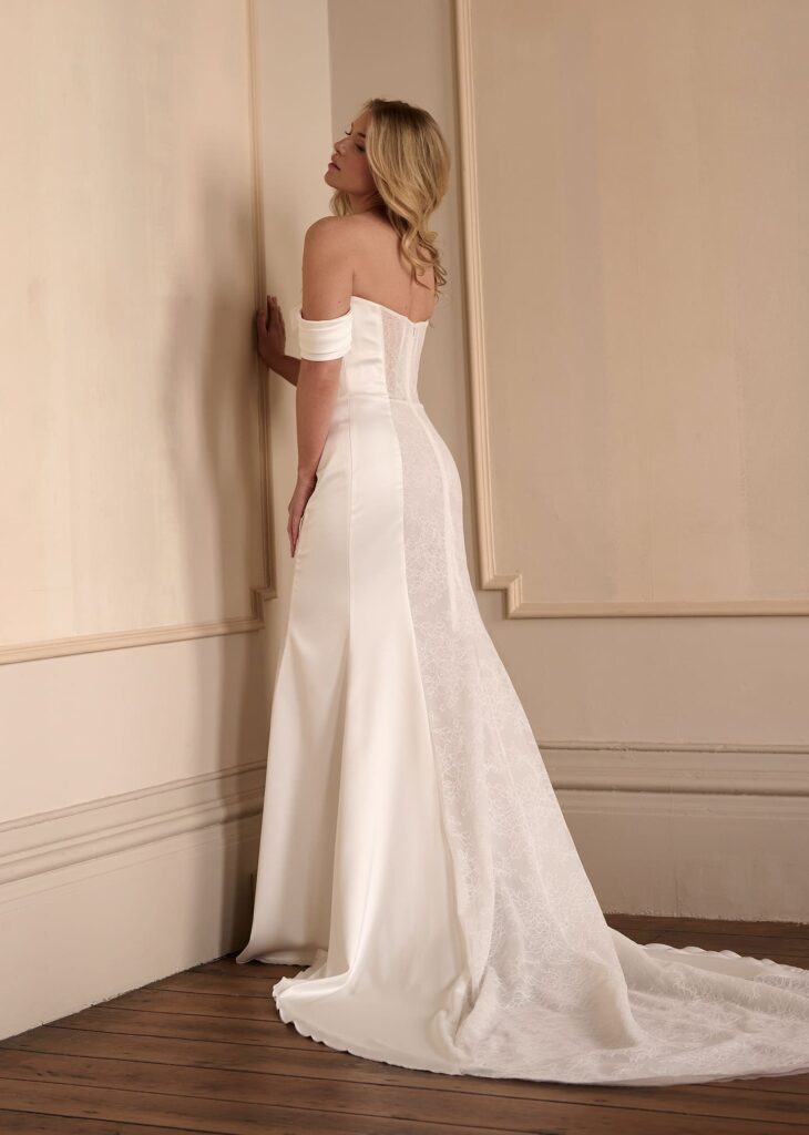 This alluring fit-and-flare gown fuses elegance with sensuality. Featuring a corset-inspired bodice, off-the-shoulder satin draping, and lace paneling through the skirt, it accentuates every curve while maintaining a sophisticated silhouette. A stunning choice for the bride who wants both structure and softness.