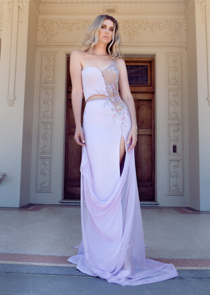 Crepe lilac dress with asymmetric colourful embroideries and slit covered with a chiffon silk side train.