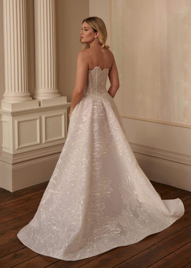 This romantic strapless ball gown features a sculpted sweetheart neckline and a structured bodice that flows into a voluminous A-line skirt. The entire dress is adorned with a luxurious oversized floral embroidery on a sheer overlay, giving it an ethereal and botanical elegance. The pattern is artfully placed to enhance the silhouette while adding depth and texture to the gown. The back continues the elegance with a clean zipper closure and a subtle train.