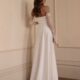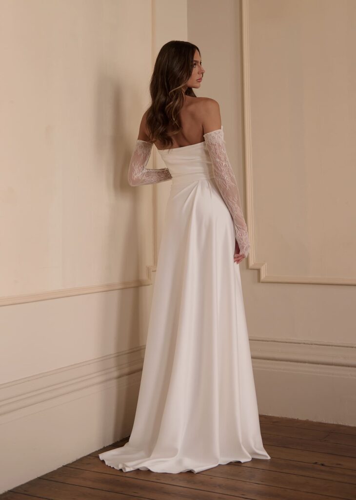 Timeless beauty meets contemporary romance in this minimalist strapless wedding gown. Made from fluid satin that drapes effortlessly, the gown features delicate pleating across the bodice and an elegant flow to the floor. Complete the look with detachable lace gloves for a touch of vintage charm.