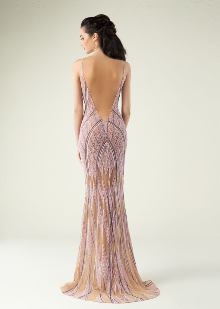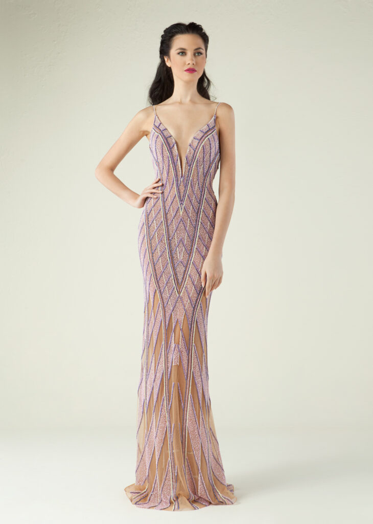 A degradation of pink Violet long deep V neck dress with thin stapes and an open back. Entirely embroidered with geometrical design of pink violet and yellow crystal micro beads.