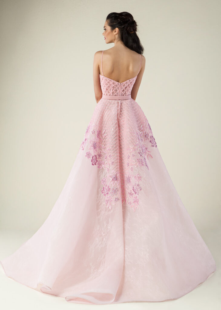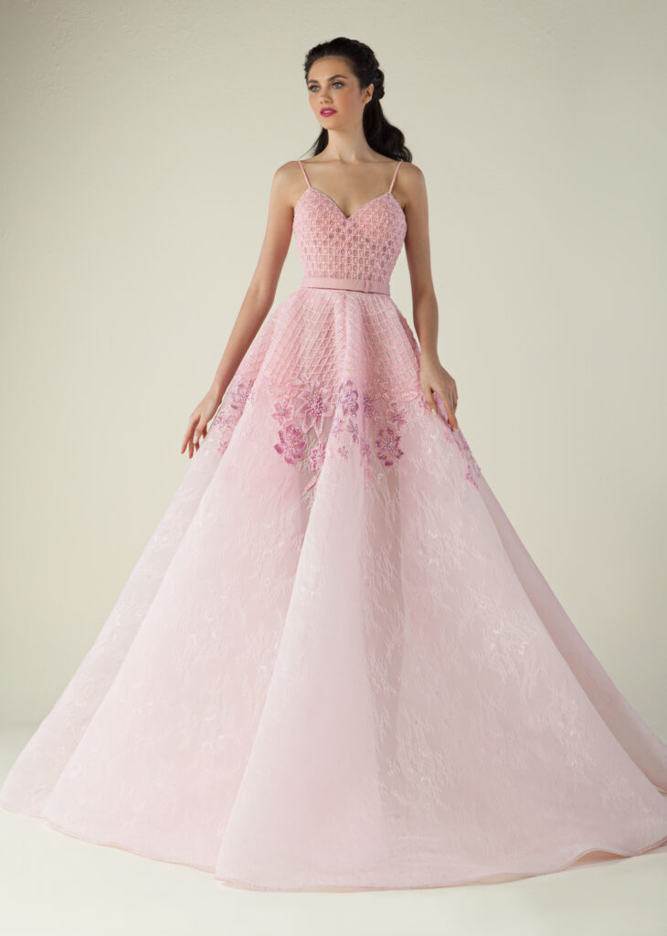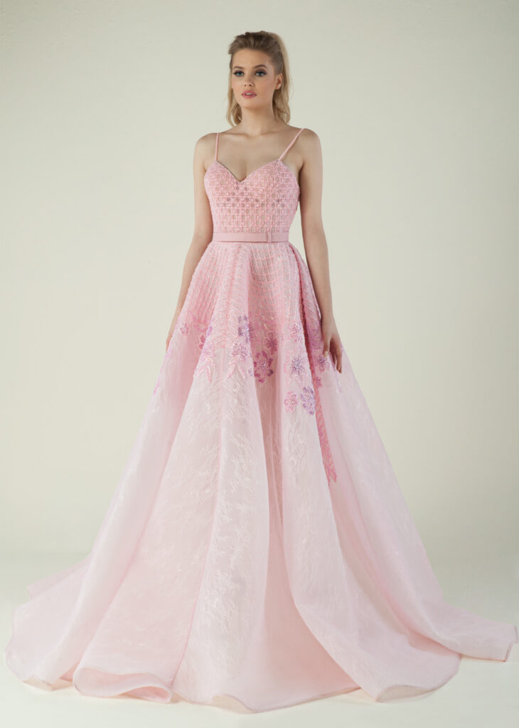 Ball gown fitted at the waist with a matching belt and flat lace on the skirt. Fully embroidered heart shape bustier following floral embroideries of tone pink crystal and sequins.