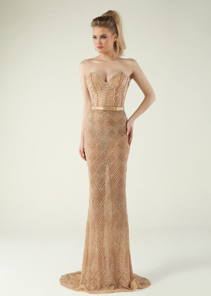 Strapless Corset long dress with embellished sequins and micro golden beads. Enhanced with belt on the waist.