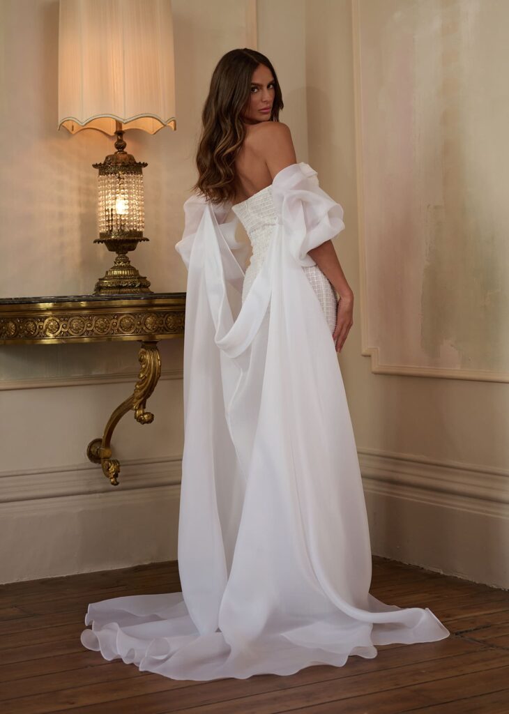 Make a statement in minimalist sophistication with the “Modern Grace” gown. This strapless column silhouette features a structured grid-textured bodice that contours the figure effortlessly. The look is elevated by detachable organza bishop sleeves that drape dramatically to the floor, adding a touch of ethereal romance to this contemporary bridal piece.