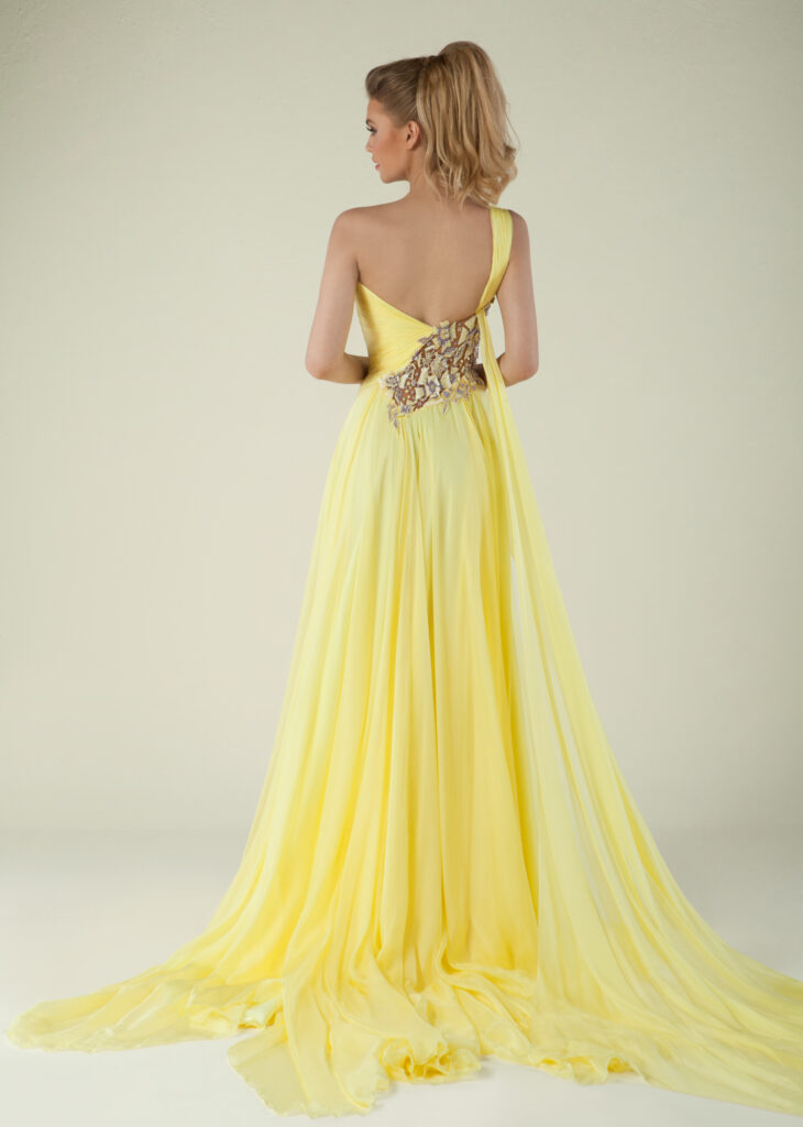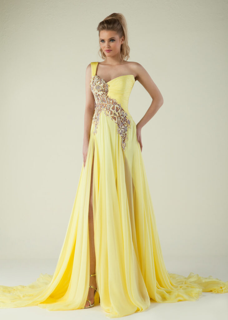 Silky yellow chiffon dress. Embellished with one sided 3D embroidered flowers of yellow and Lila sequins and one strap.